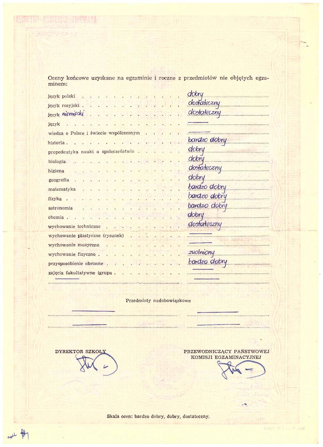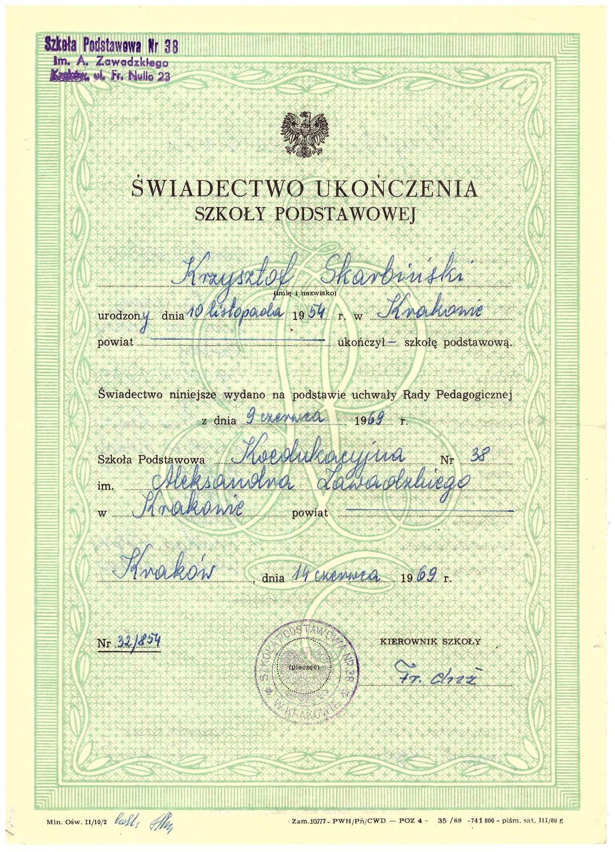 - świadectwo ukończenia Szkoły Podstawowej nr 38 Kraków ul. Nullo 23 czerwiec 1969 r