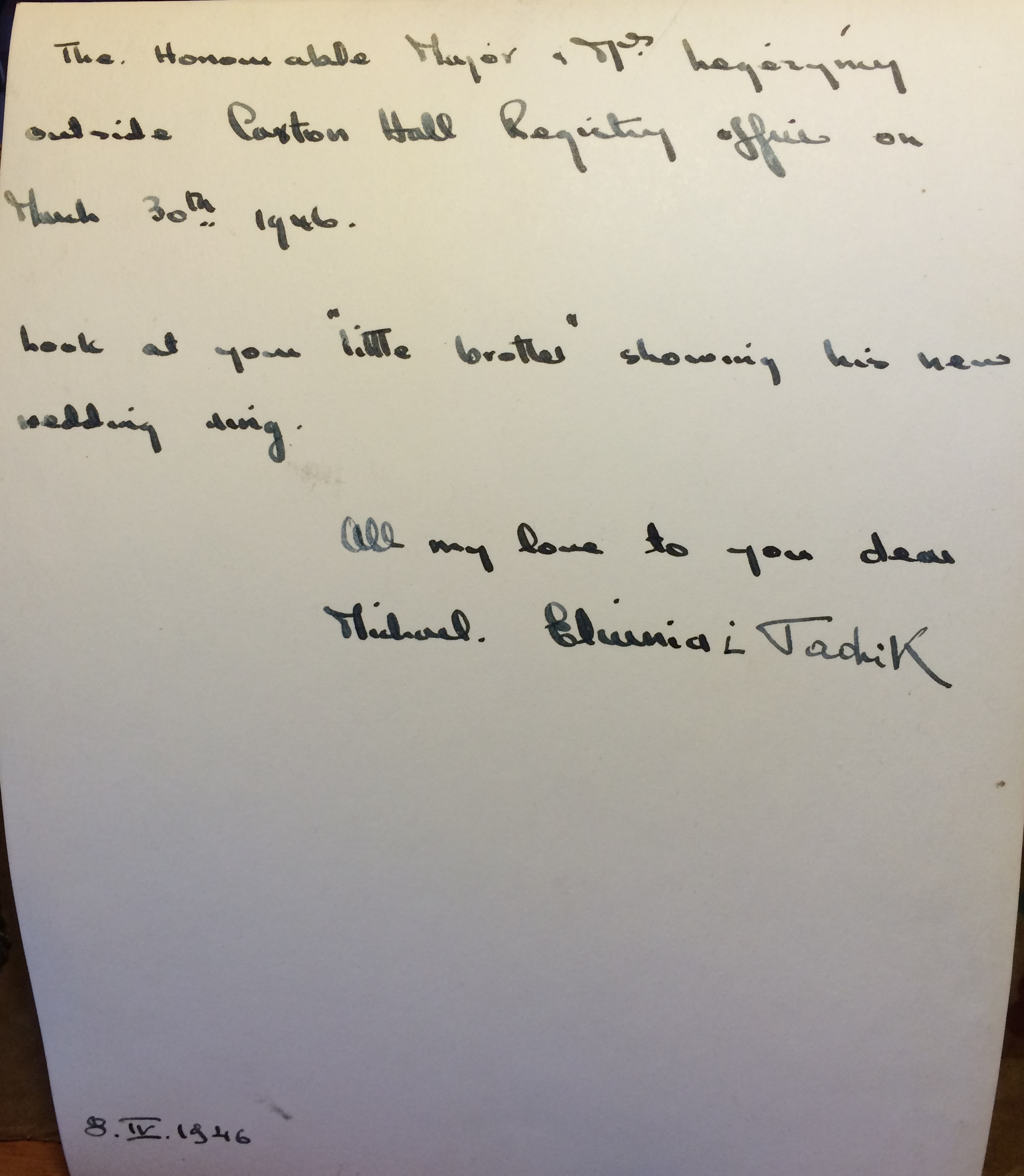 - Tadeusz i Elsie Mortlock Legeżyńscy dedykacja zdjęcia ślubnego dla Michała Legeżyńskiego, brata Tadeusza