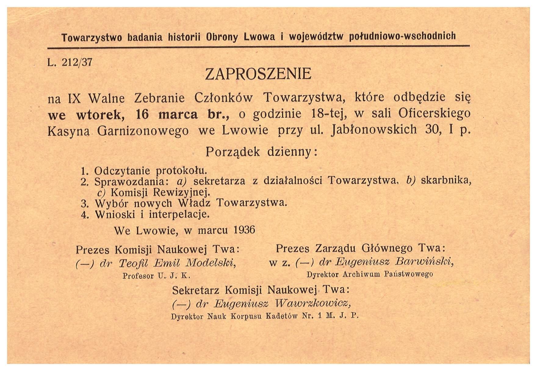 - Tow Badania Historii Obrony Lwowa etc zaproszenie 1937r
