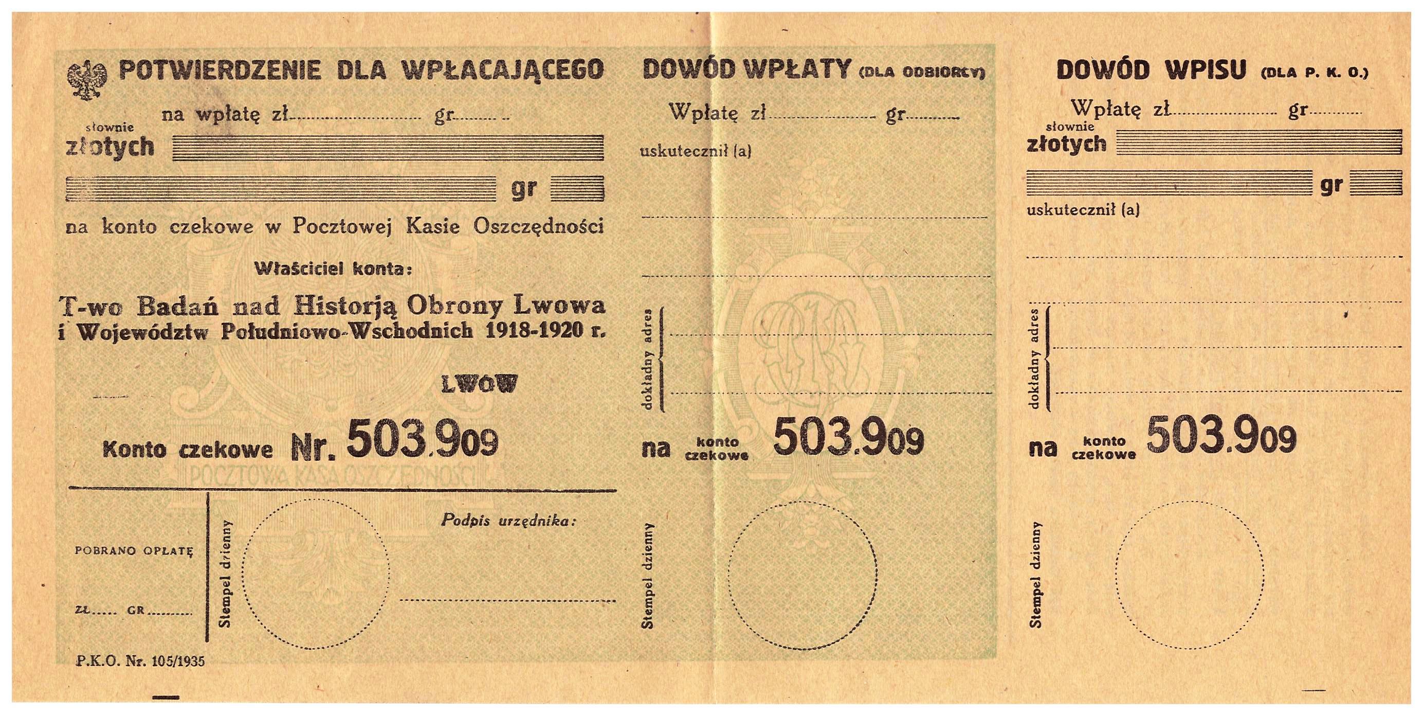 - Tow Badania Historii Obrony Lwowa etc przekaz na wpłatę 1937r