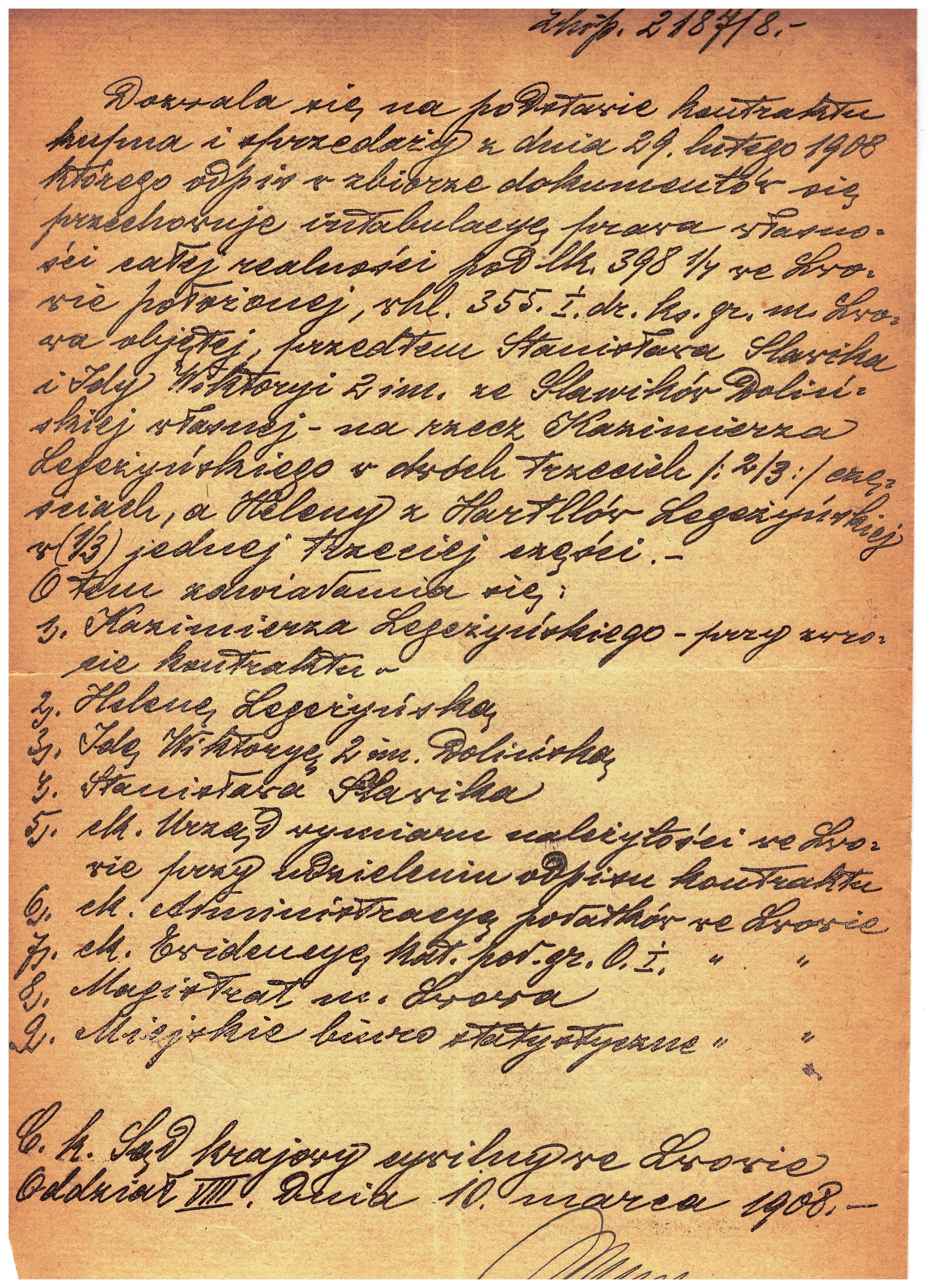 - Lwów 1908r kontrakt kupna i sprzedaży realności K. Legeżyński 1