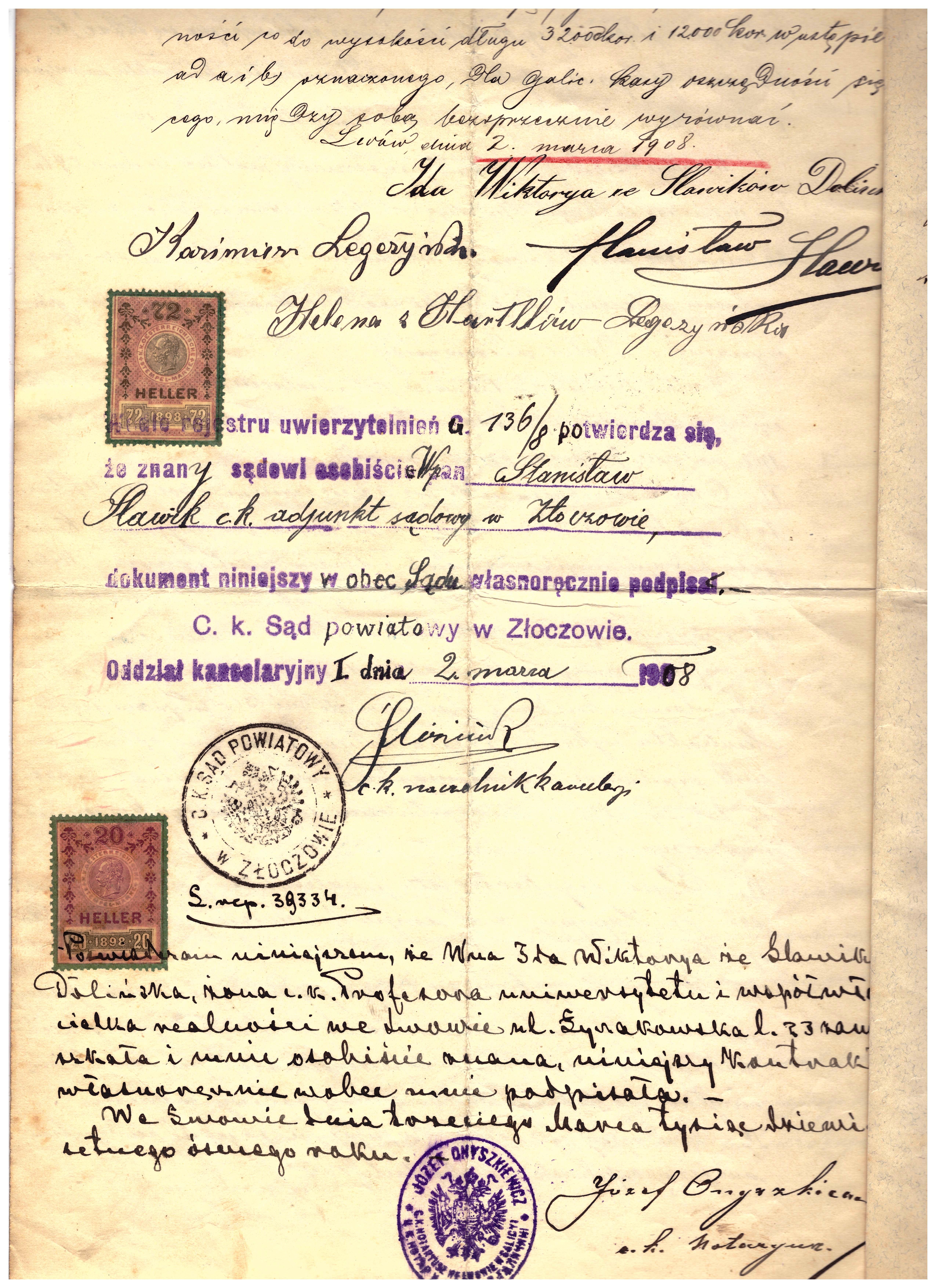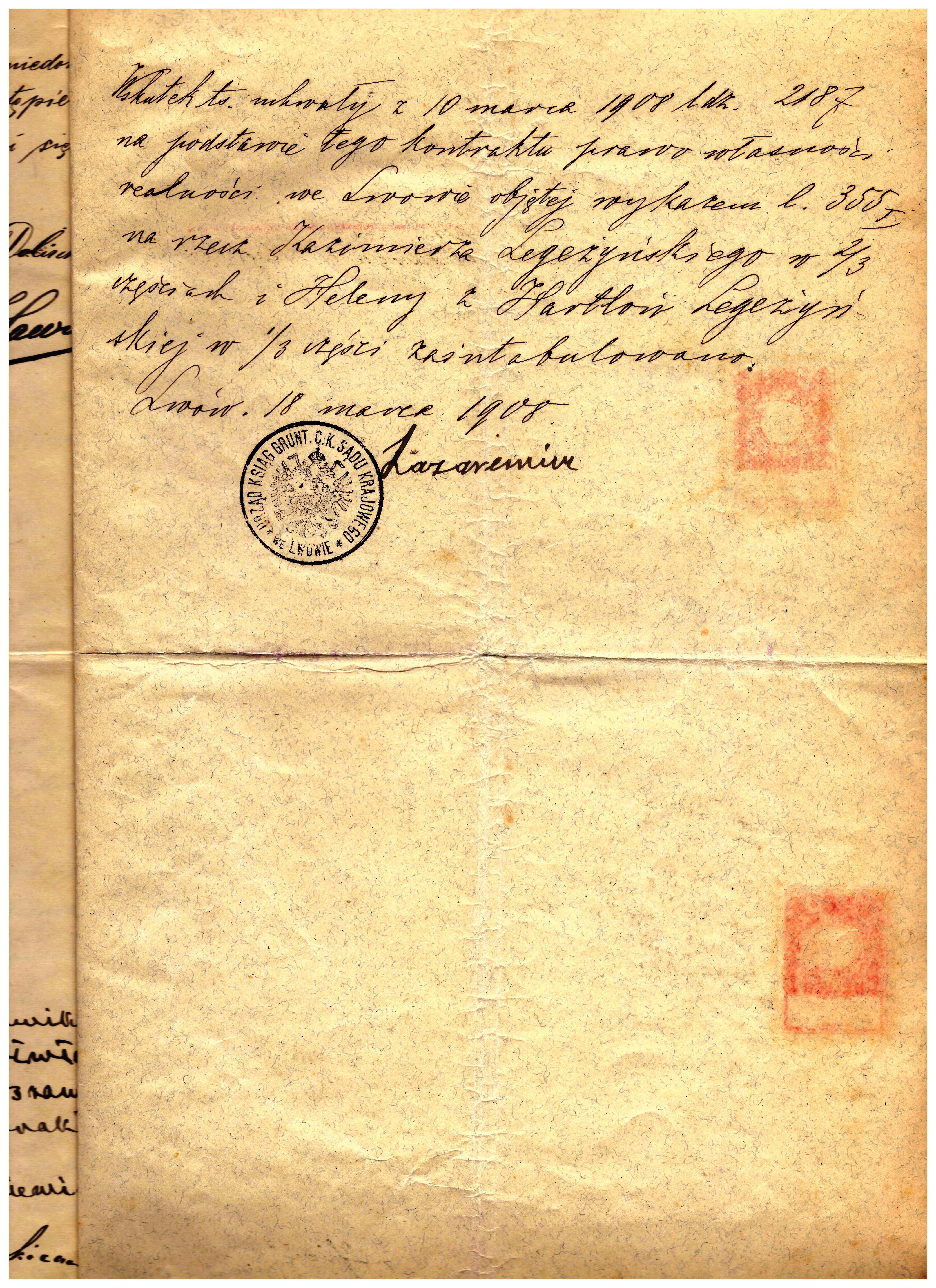 - Lwów 1908 r intabulacja prawa własności realności K. Legeżyńskiego C.K. Sąd Krajowy cywilny we Lwowie