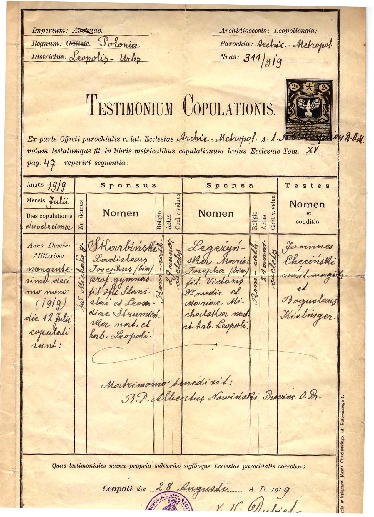 - akt ślubu 1919r Władysława i Marii Skarbińskich