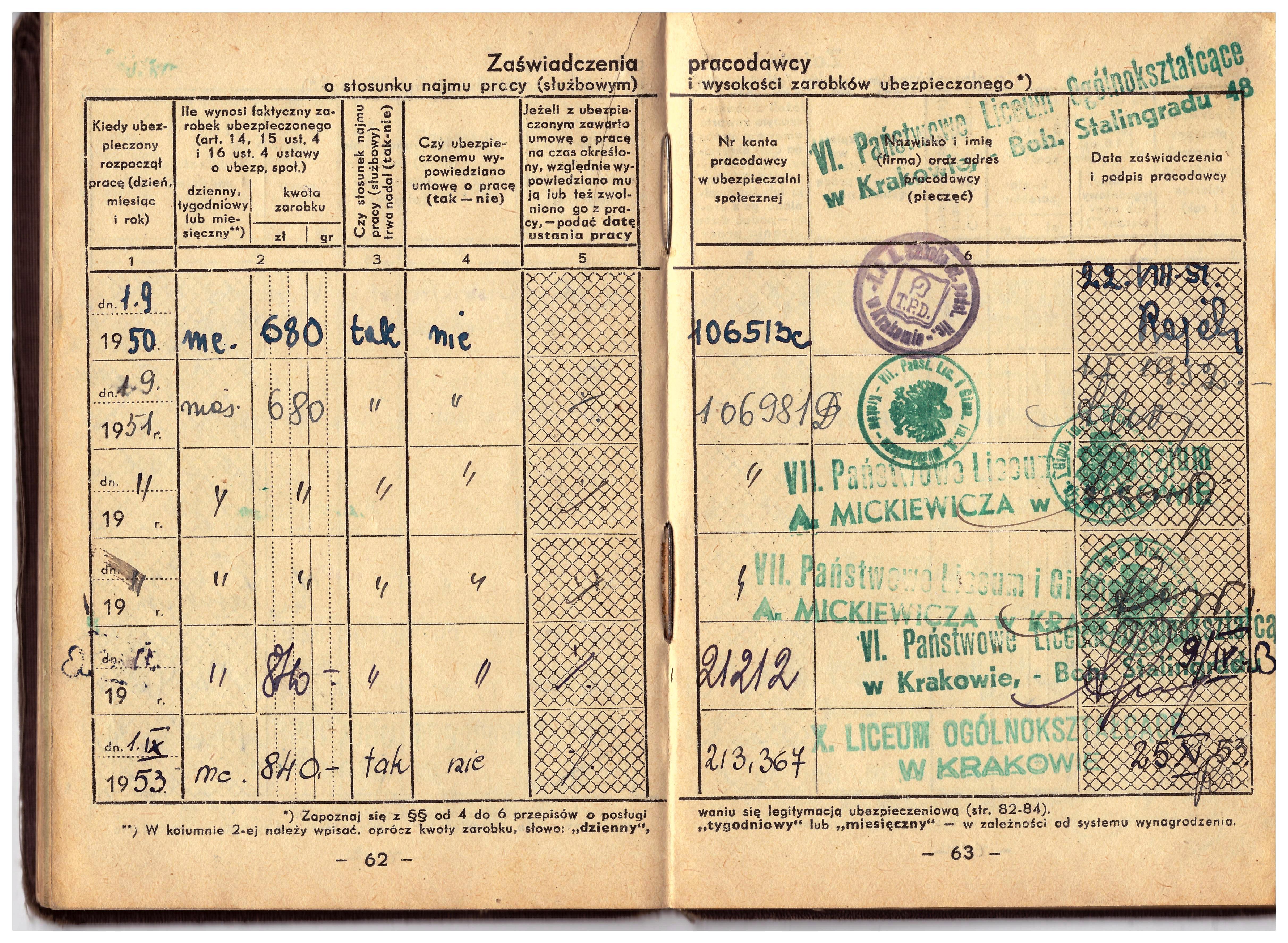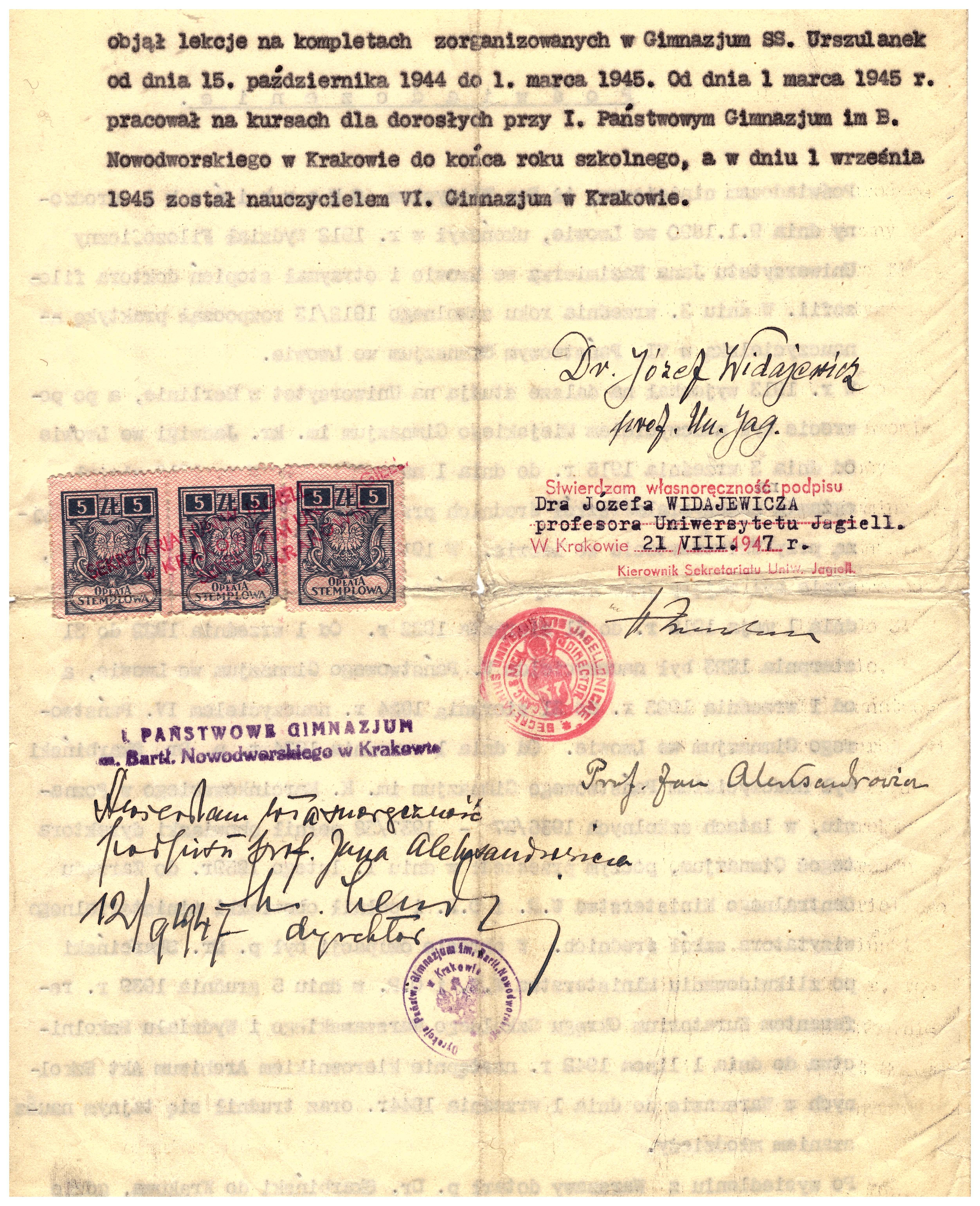 Od 1 marca 1945 r. do końca roku szkolnego pracował na kursach dla dorosłych przy I-szym Państwowym Gimnazjum im. B. Nowodworskiego w Krakowie.