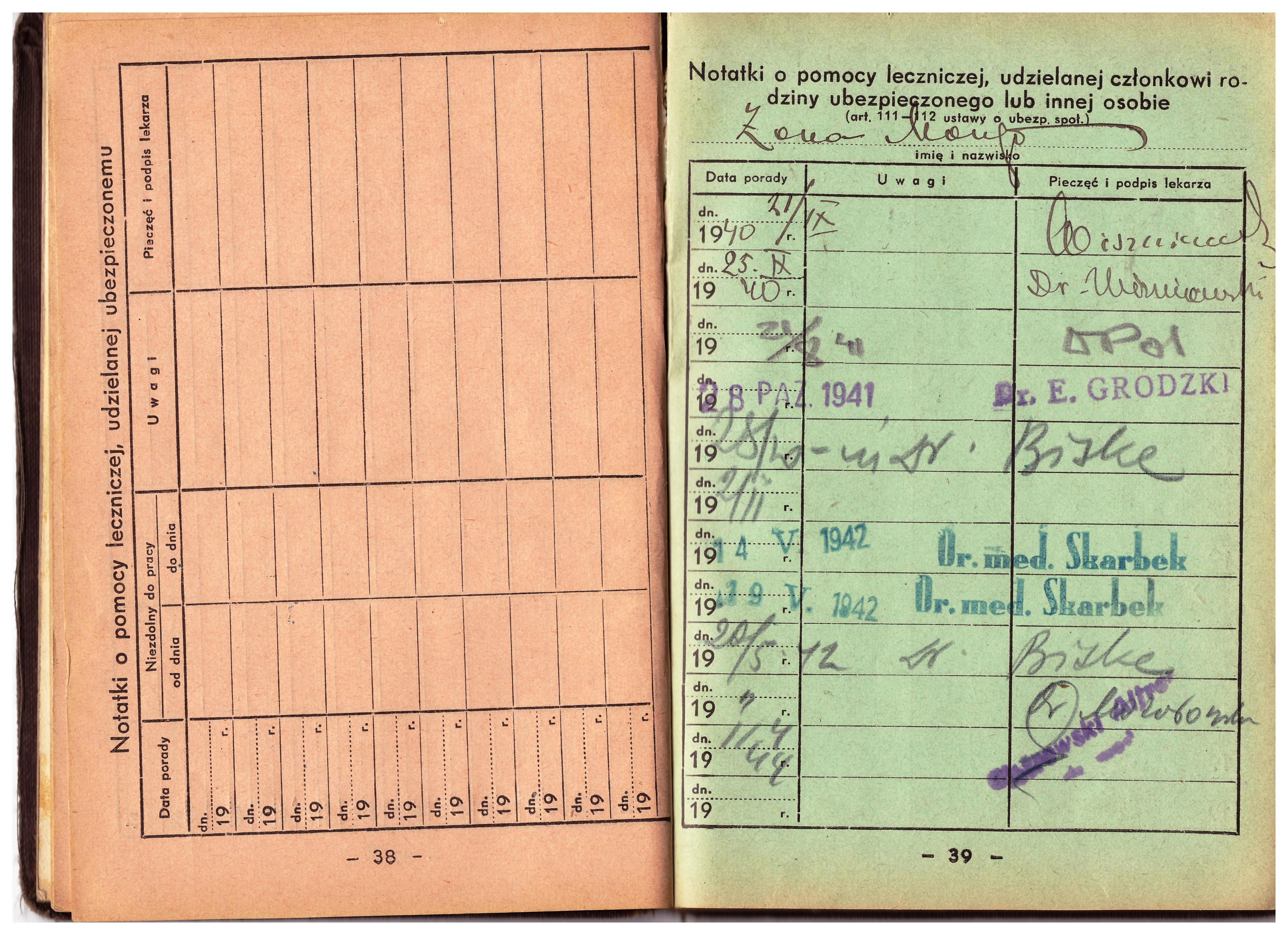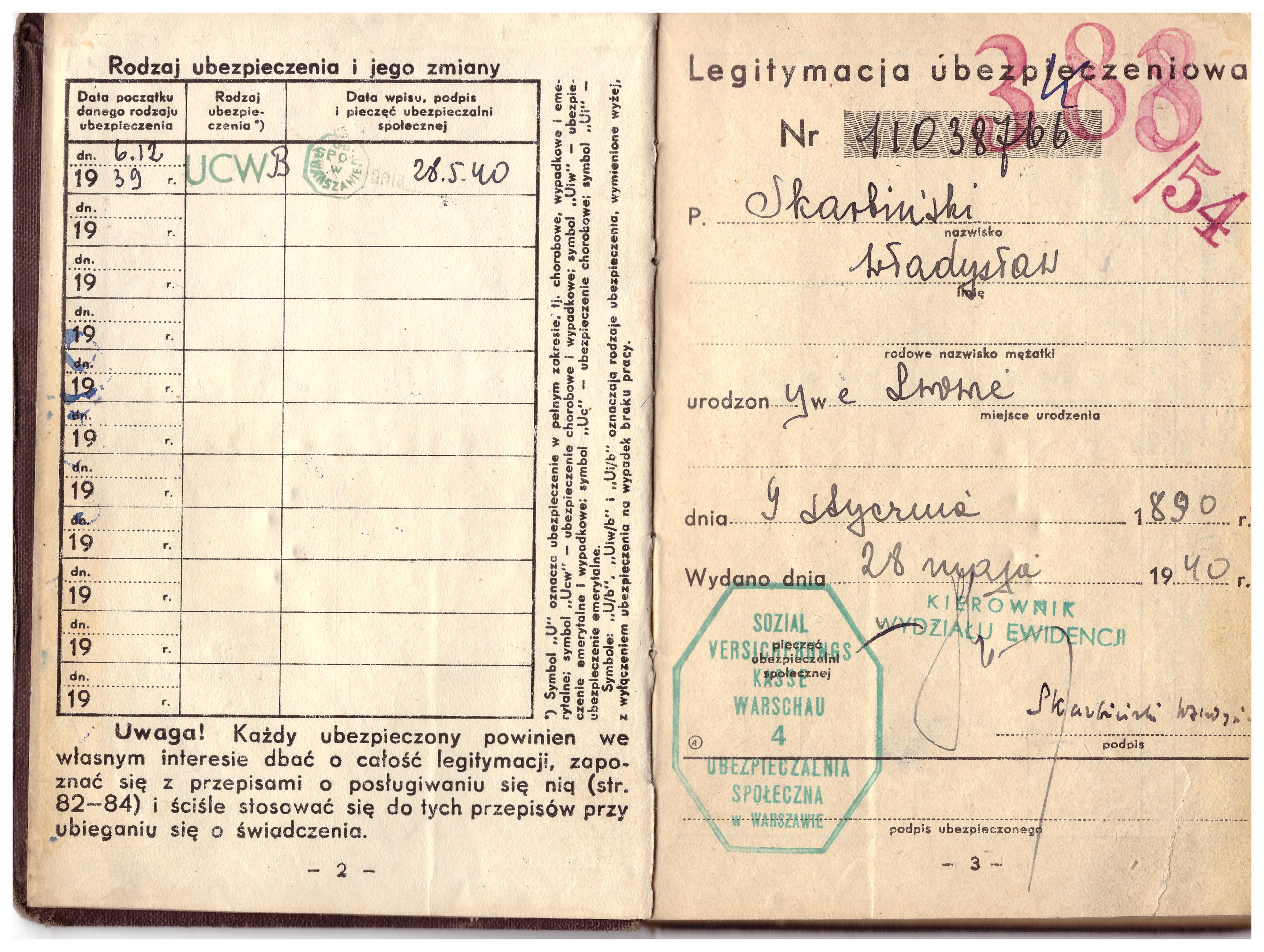 - legitymacja ubezpieczeniowa GG 1940 r Warszawa Władysław i Maria Skarbińscy 10