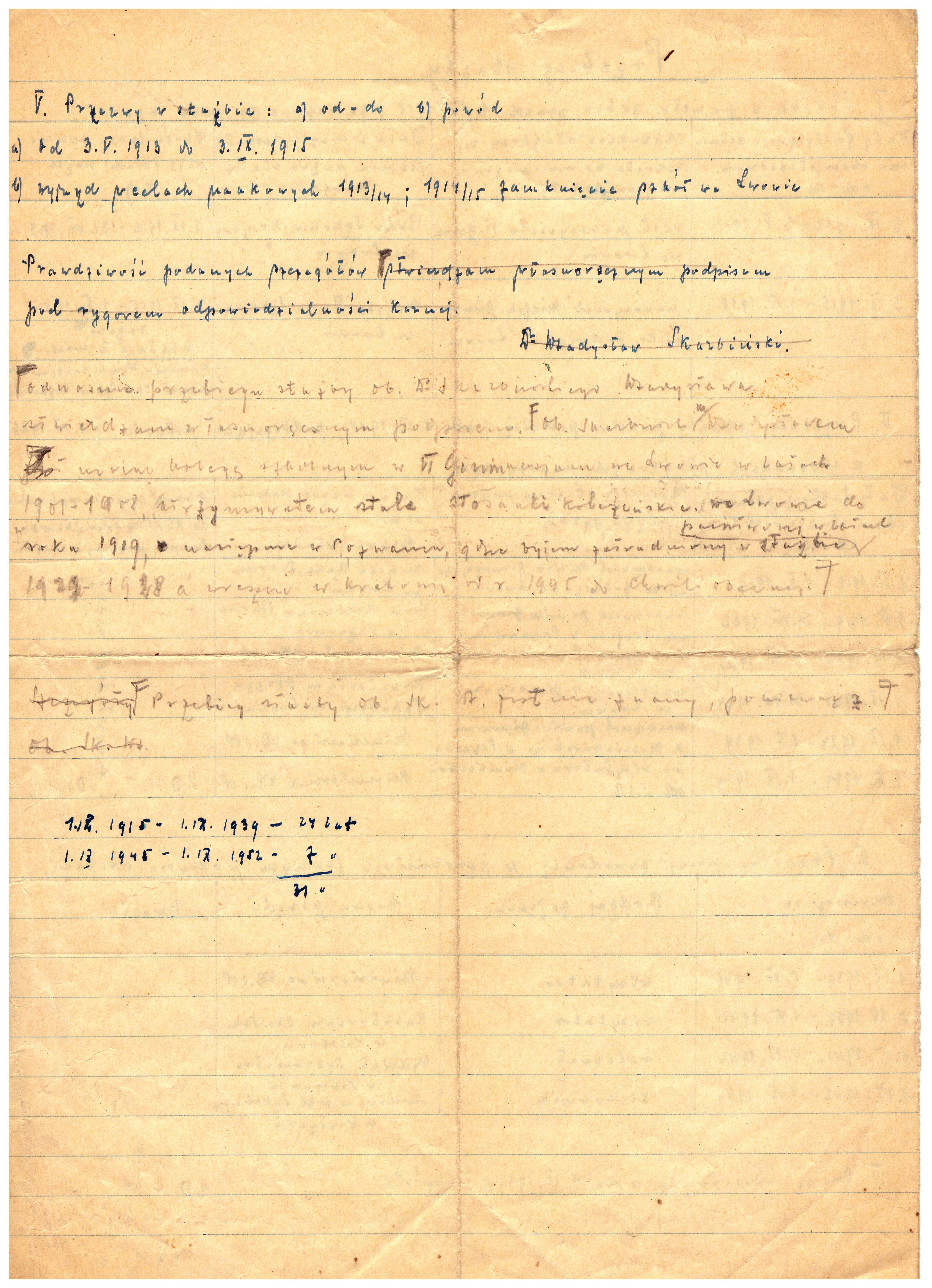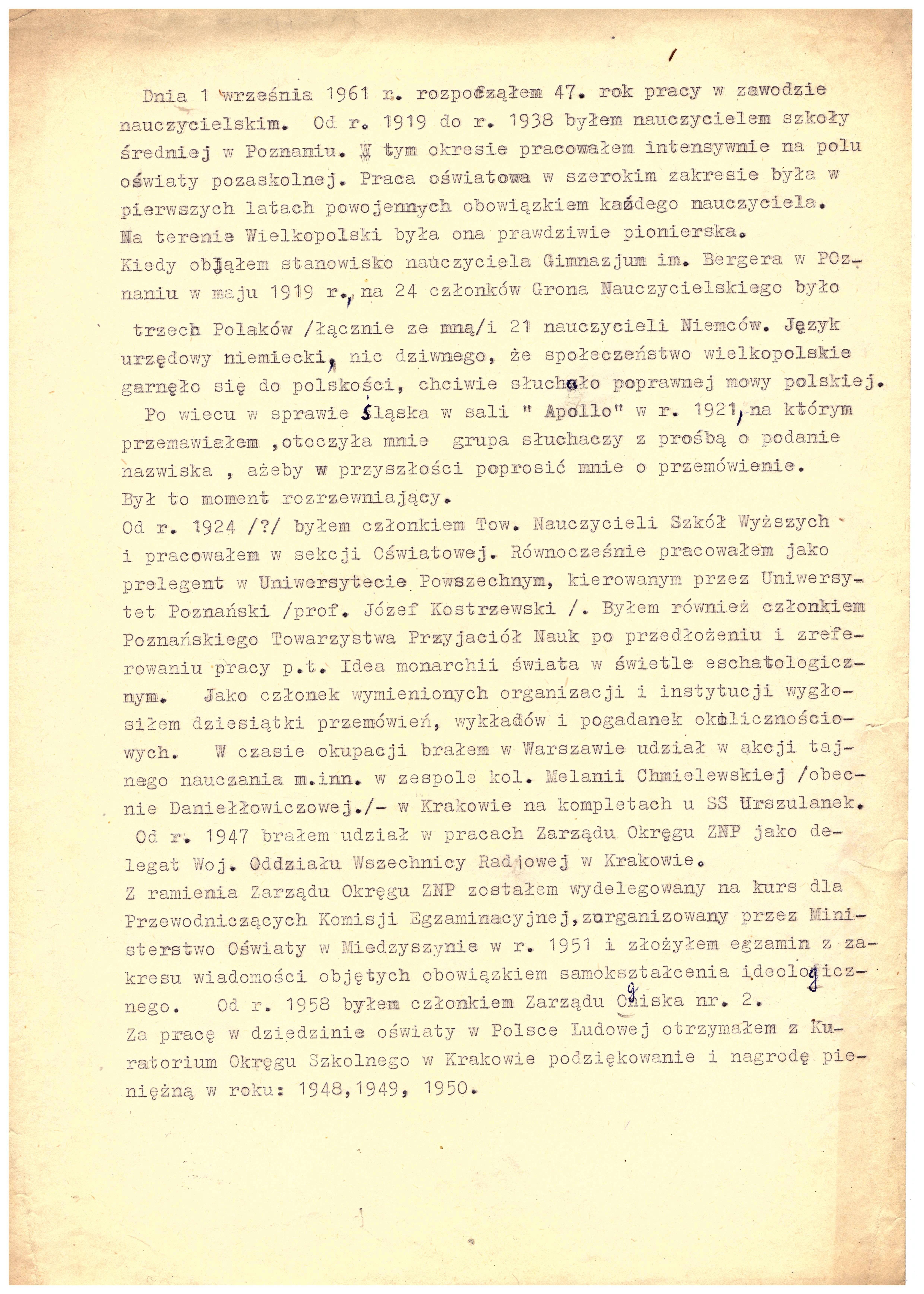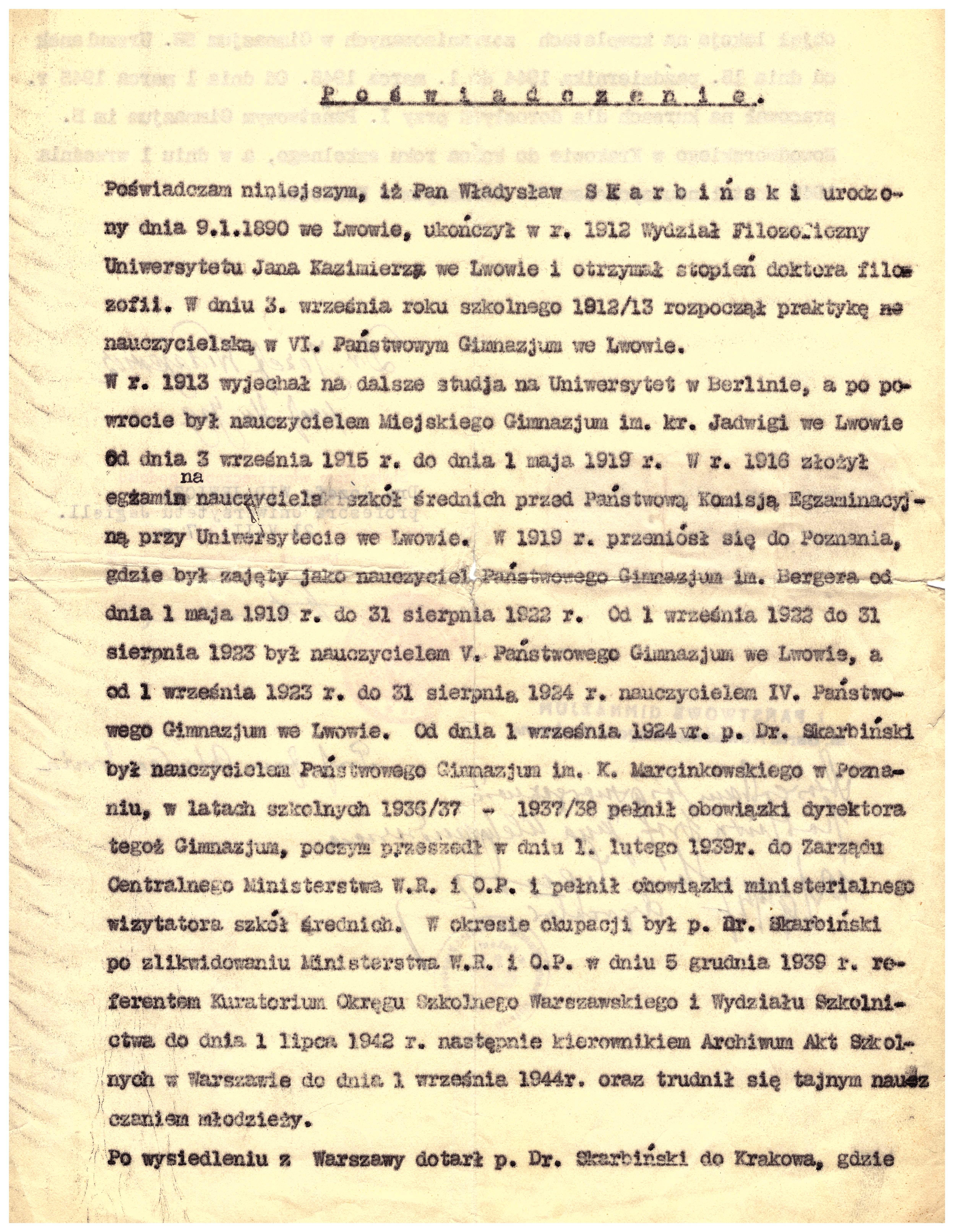 Poniżej, refleksje dr. Wł. Skarbińskiego odnośnie jego pracy jako nauczyciela szkoły średniej w Poznaniu w latach 1919-1938: