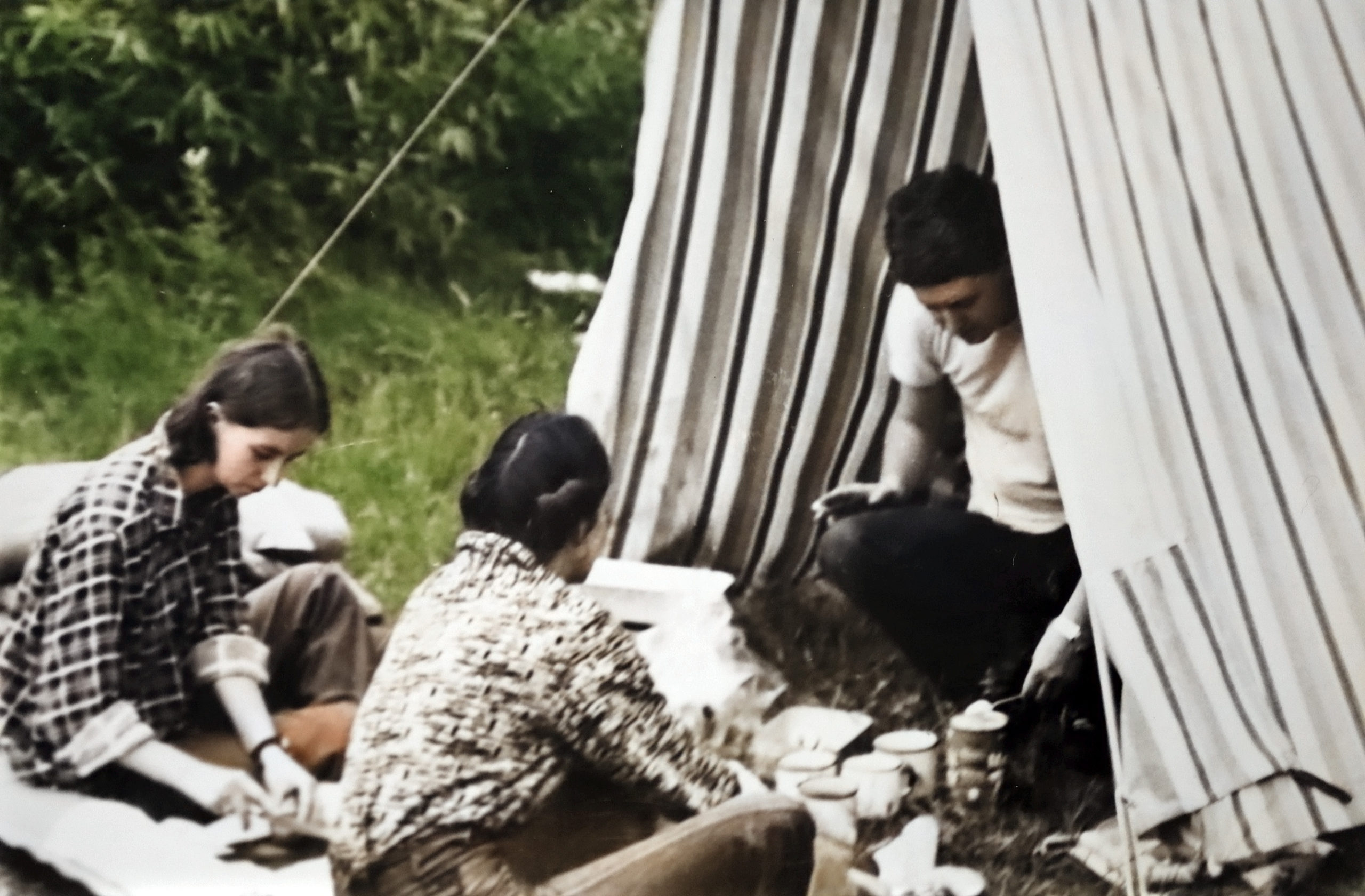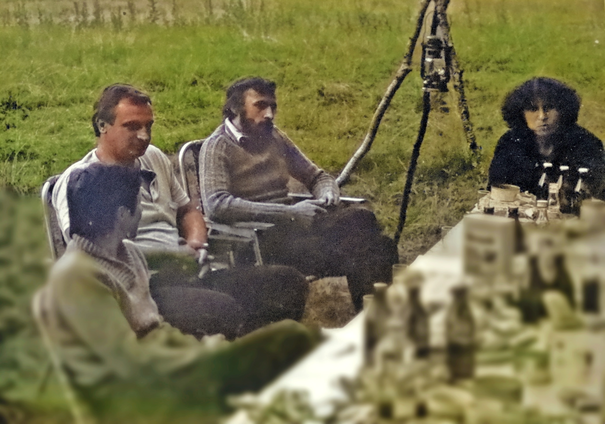 - 1979 spływ Ledą gdzieś na biwaku, luksusu nie było, jedzenie na trawie, blaszane kubki Beata Luchter, Wanda Głąb, ja – K. Skarbiński