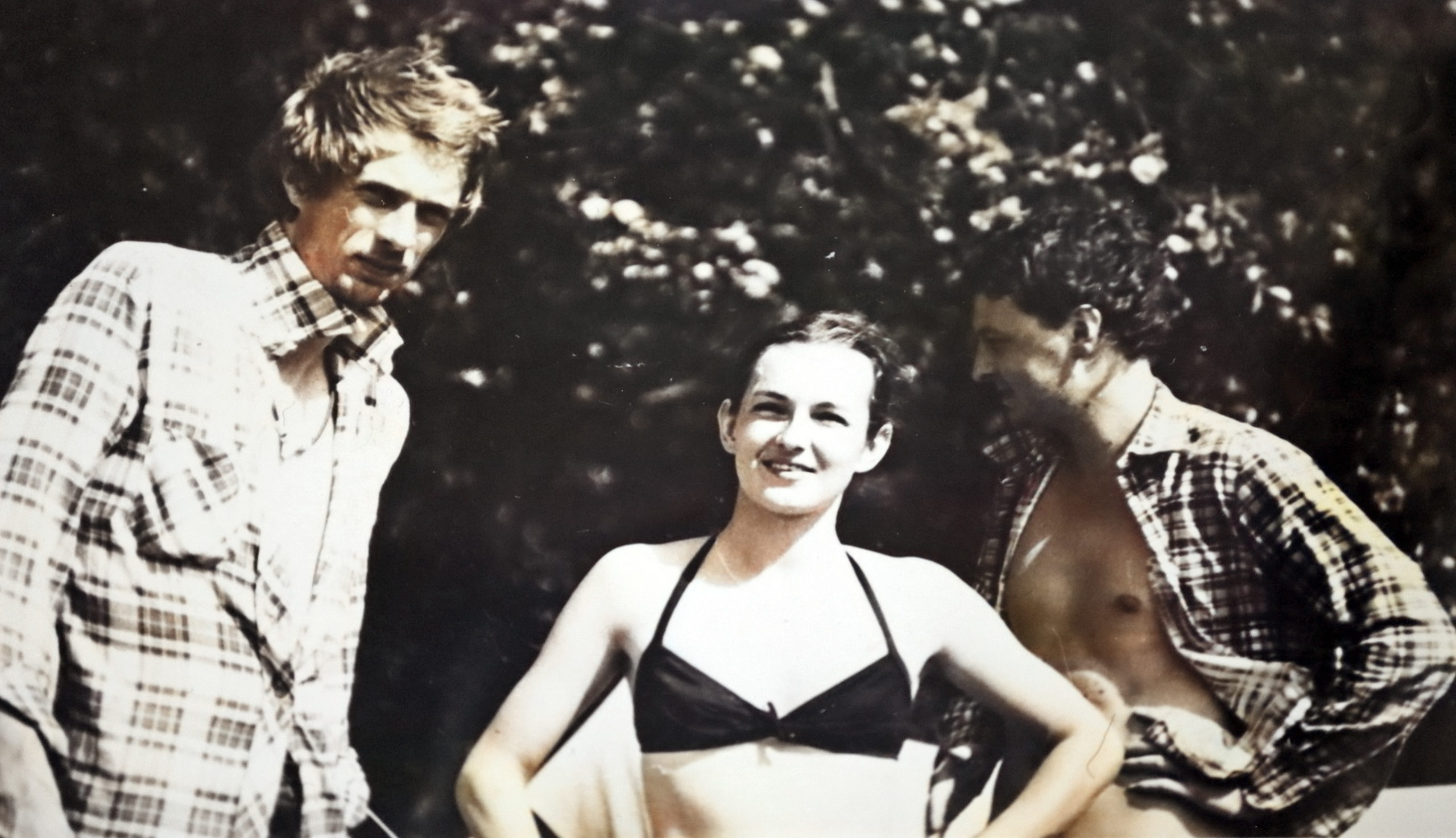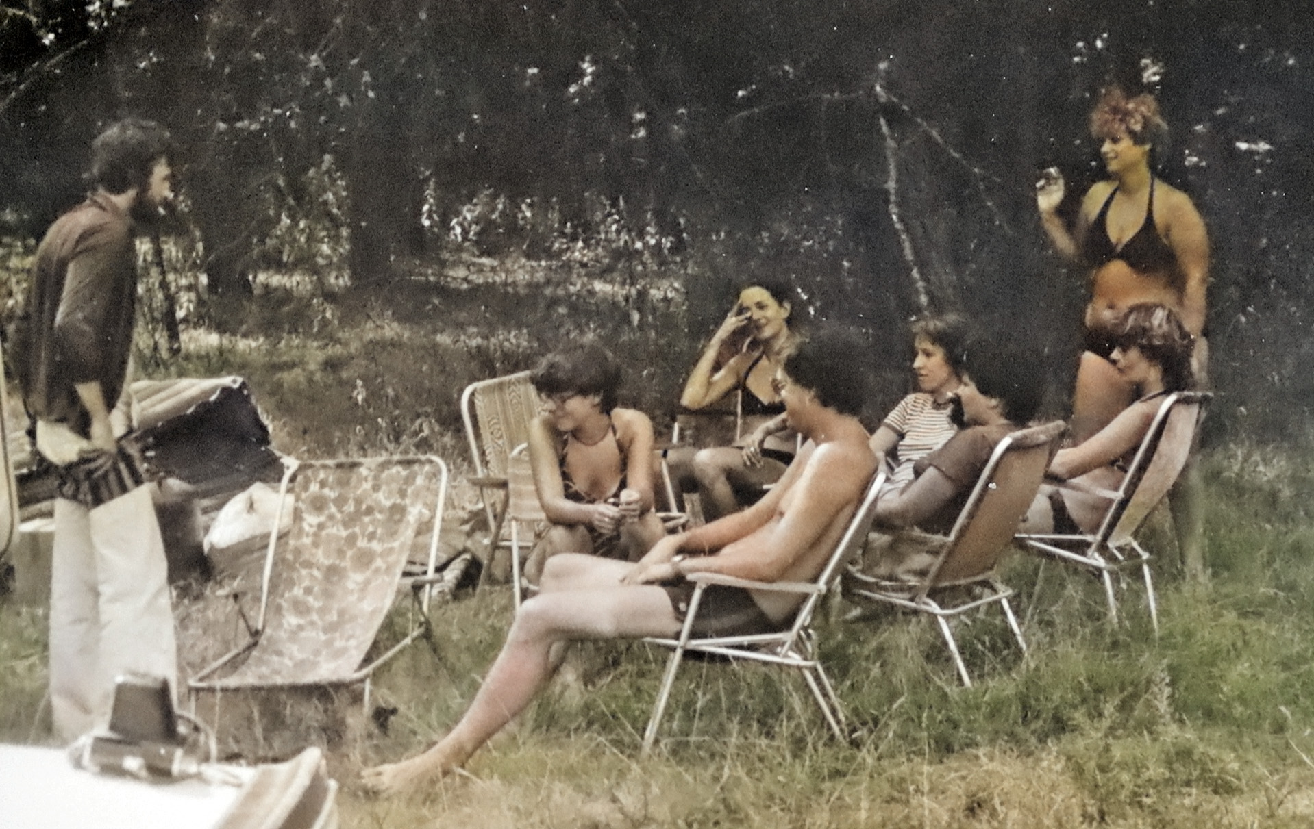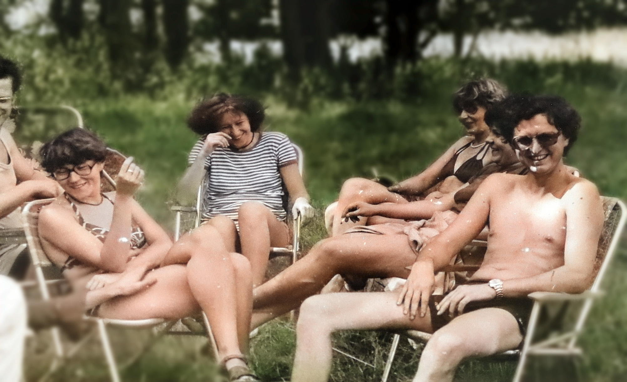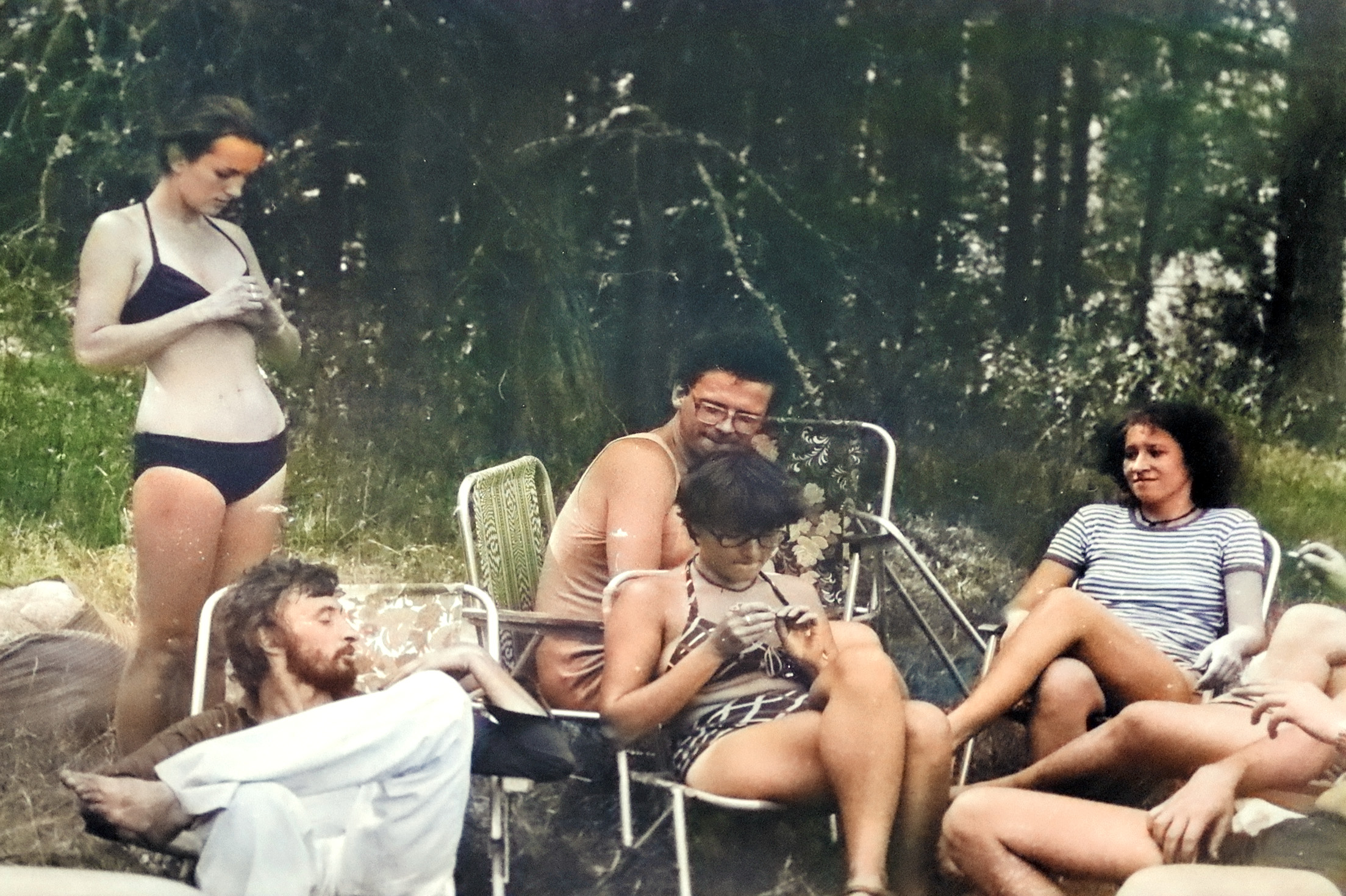 - 1981 jezioro Dłużek Wacek opowiada dowcip, słuchają Smajk Ś, Anna W, Joanna -in future- Ś, Dorota L, Zofia -in future- i ja S