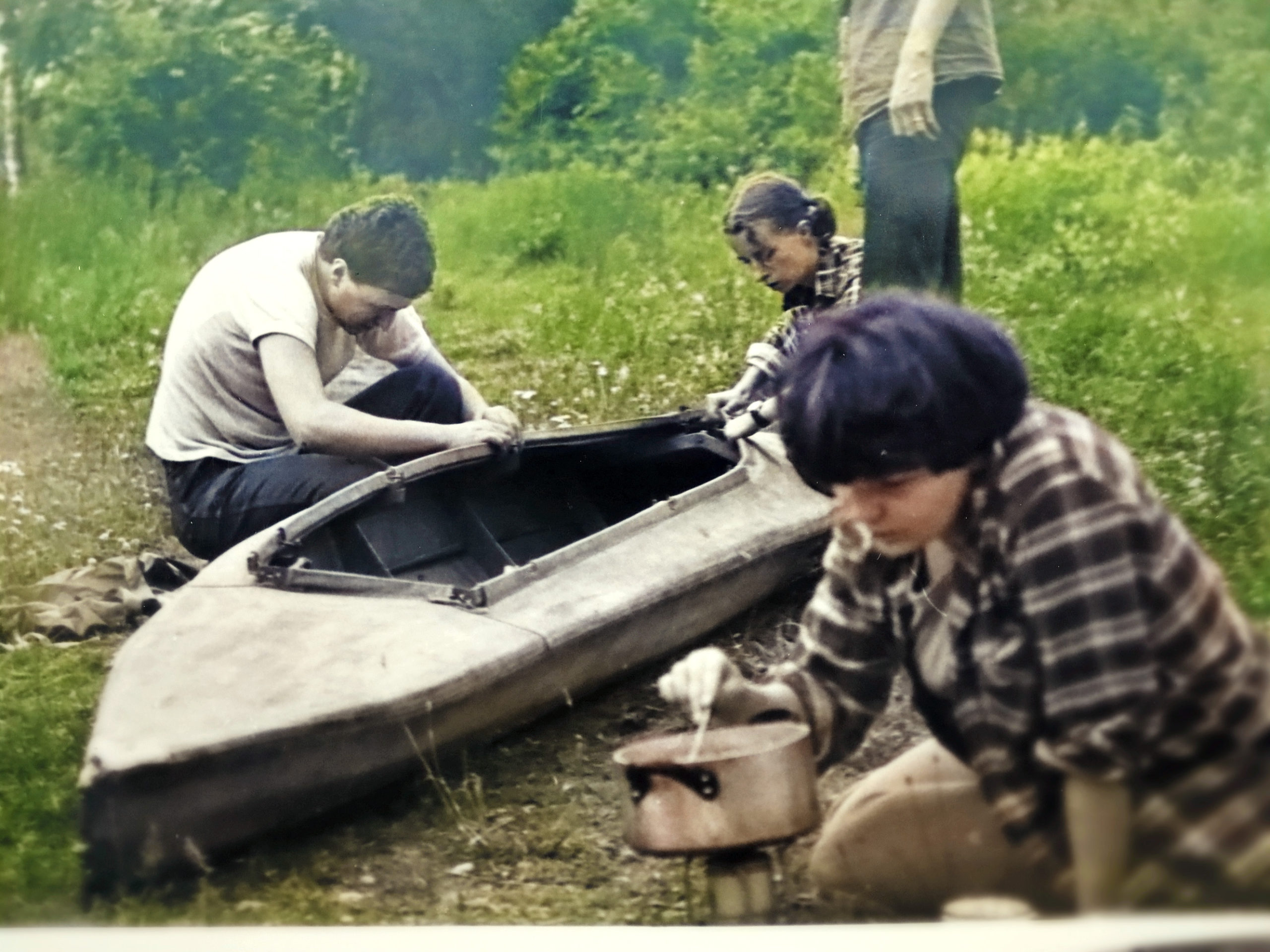 - 1979 spływ Ledą składak już prawie, biwak, zupa na butli, Krzysiek, Beata, Heniek, Zosia