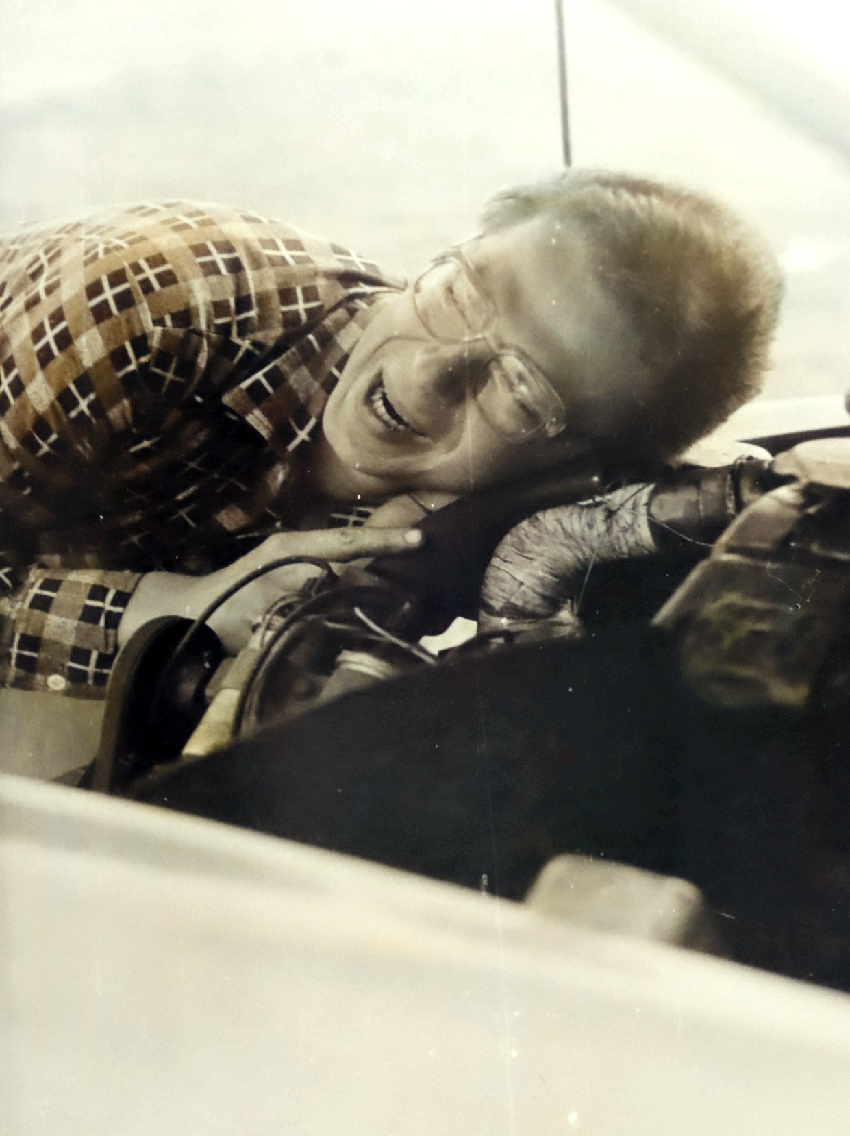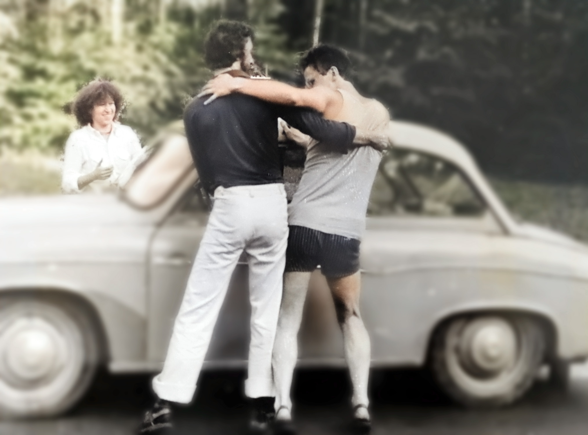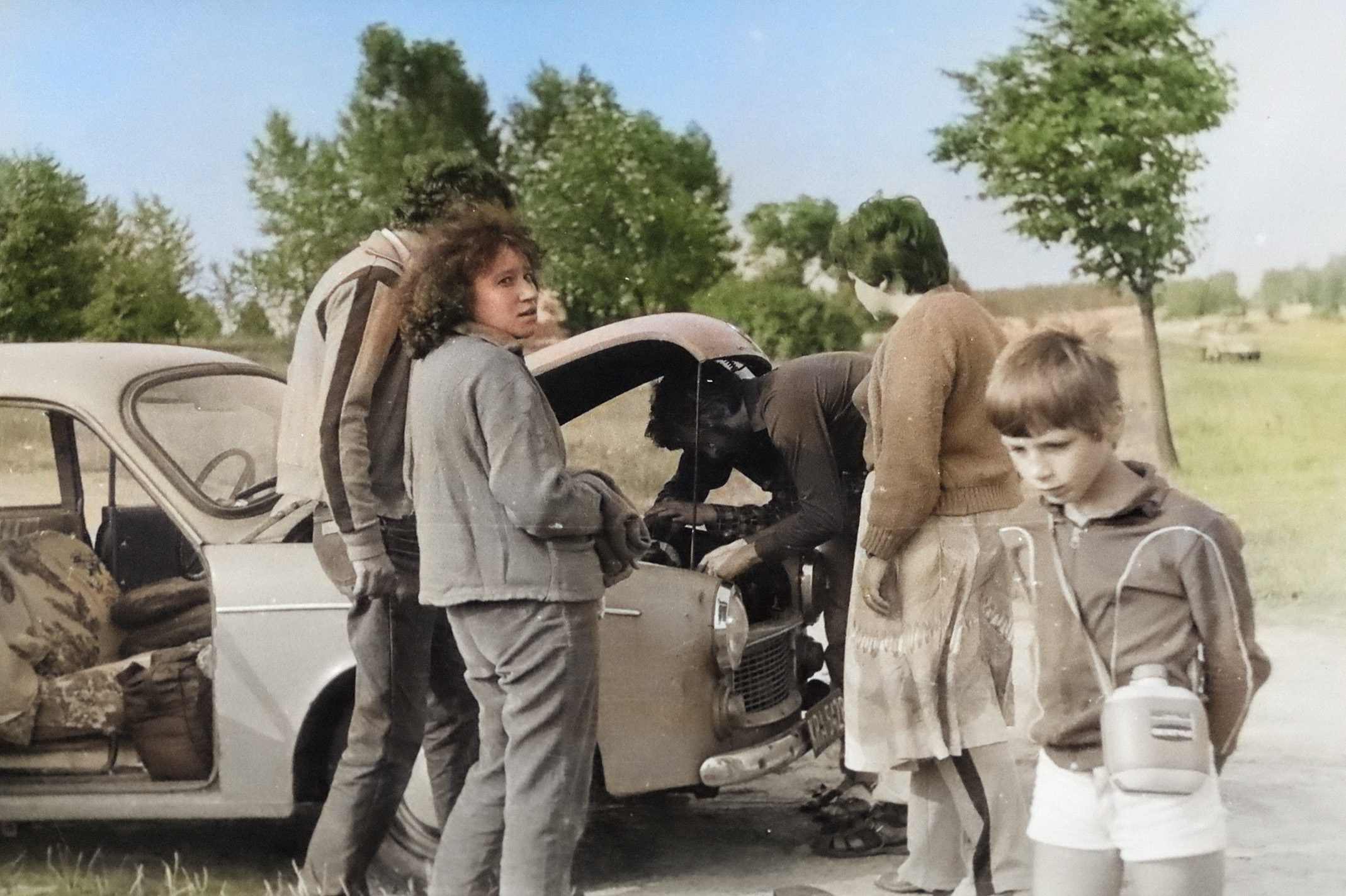 - 1981 jezioro Dłużek drugi dzień w drodze, Syrenka Smajków wymaga reanimacji, główny mechanik Wacek Luchter pod maską