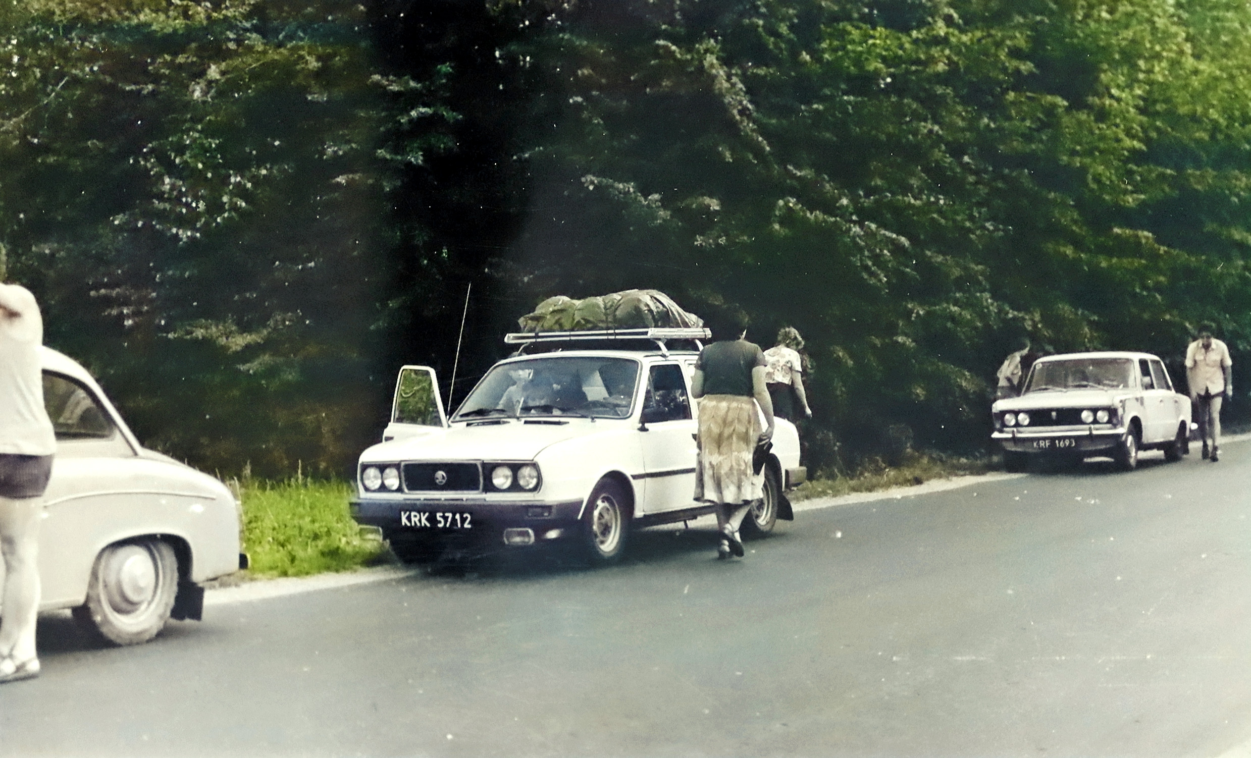 - 1981 jezioro Dłużek awaria naszego Fiata, konsylium, H. Kalinowska z przyczepą w tle, Zocha, ja, Wacek Luchter, Wanda Głąb