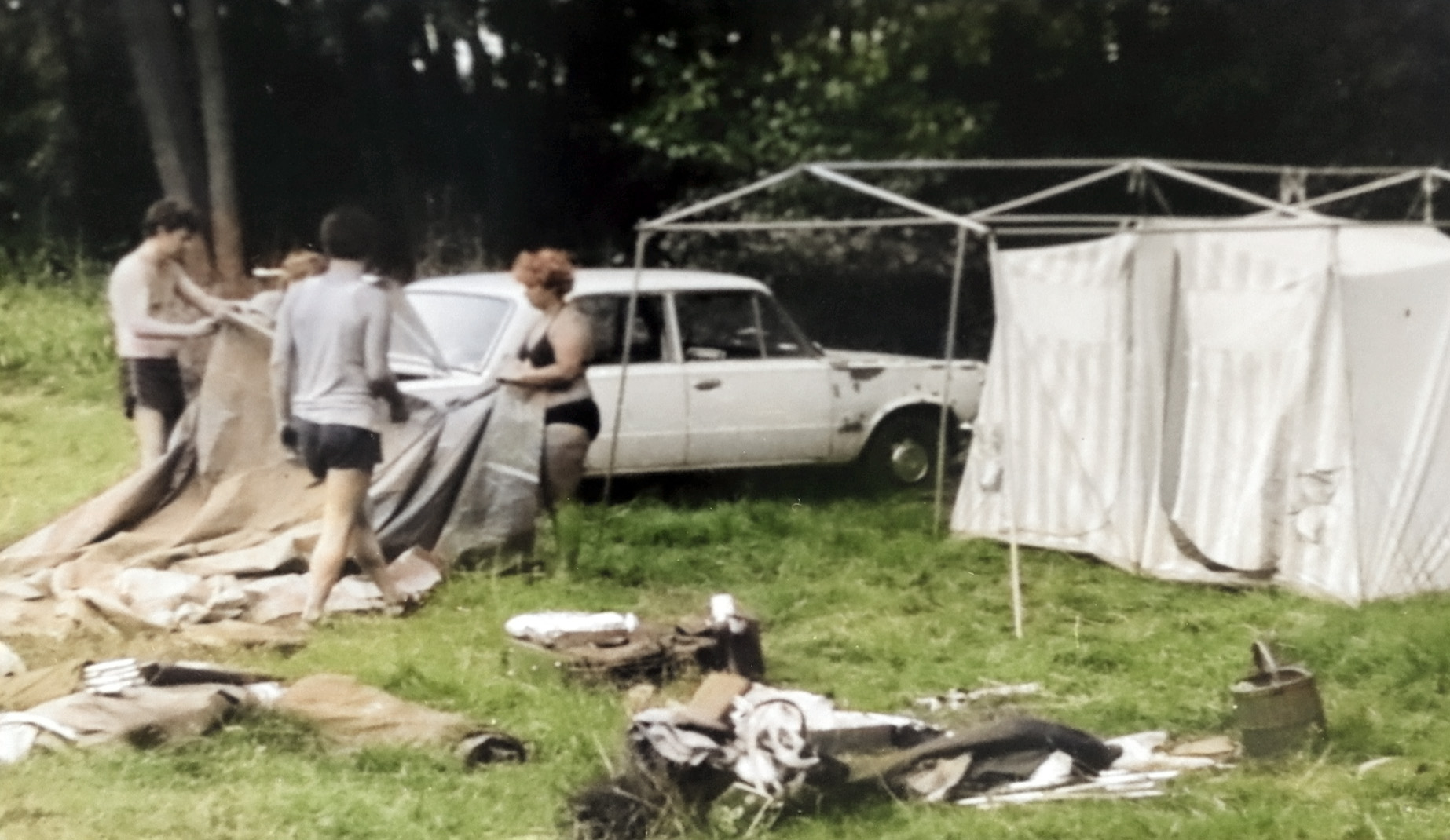- 1981 jezioro Dłużek przyczepa Kalinowskich cały naszym sprzęt kempingowy wyładowuje Smajk i Wacek Luchter, stoją bezczynnie ja i Anna Wądolny