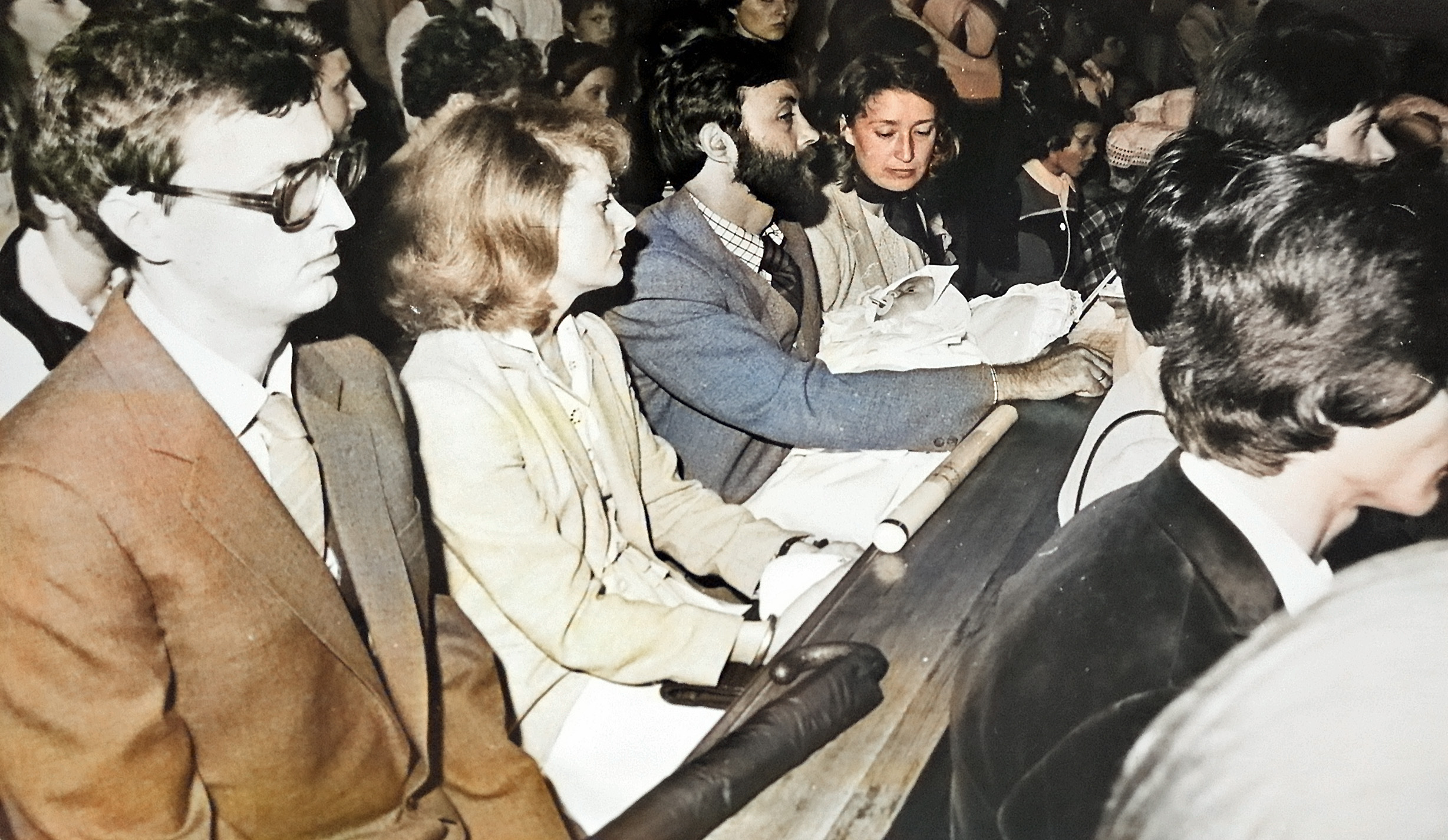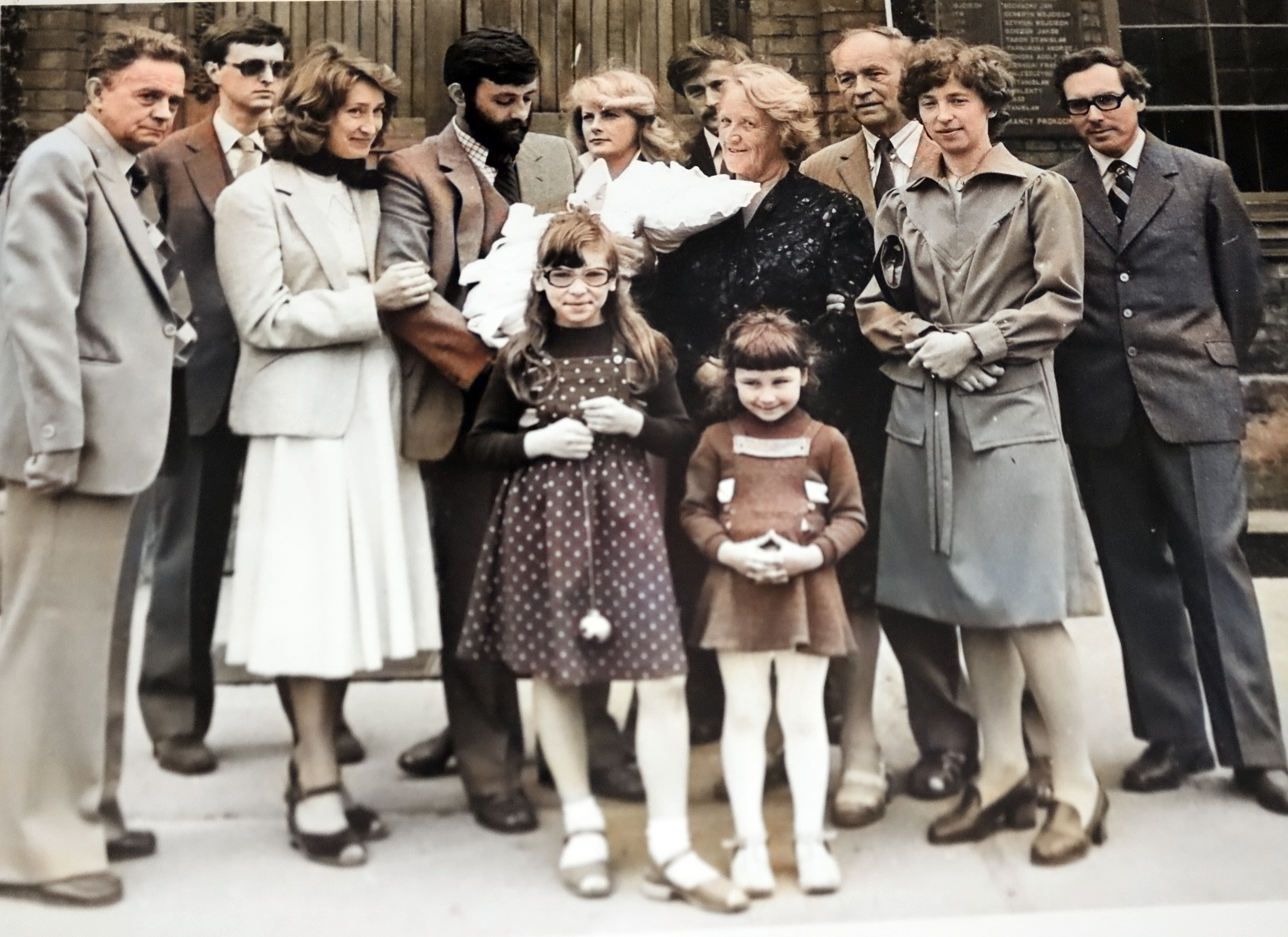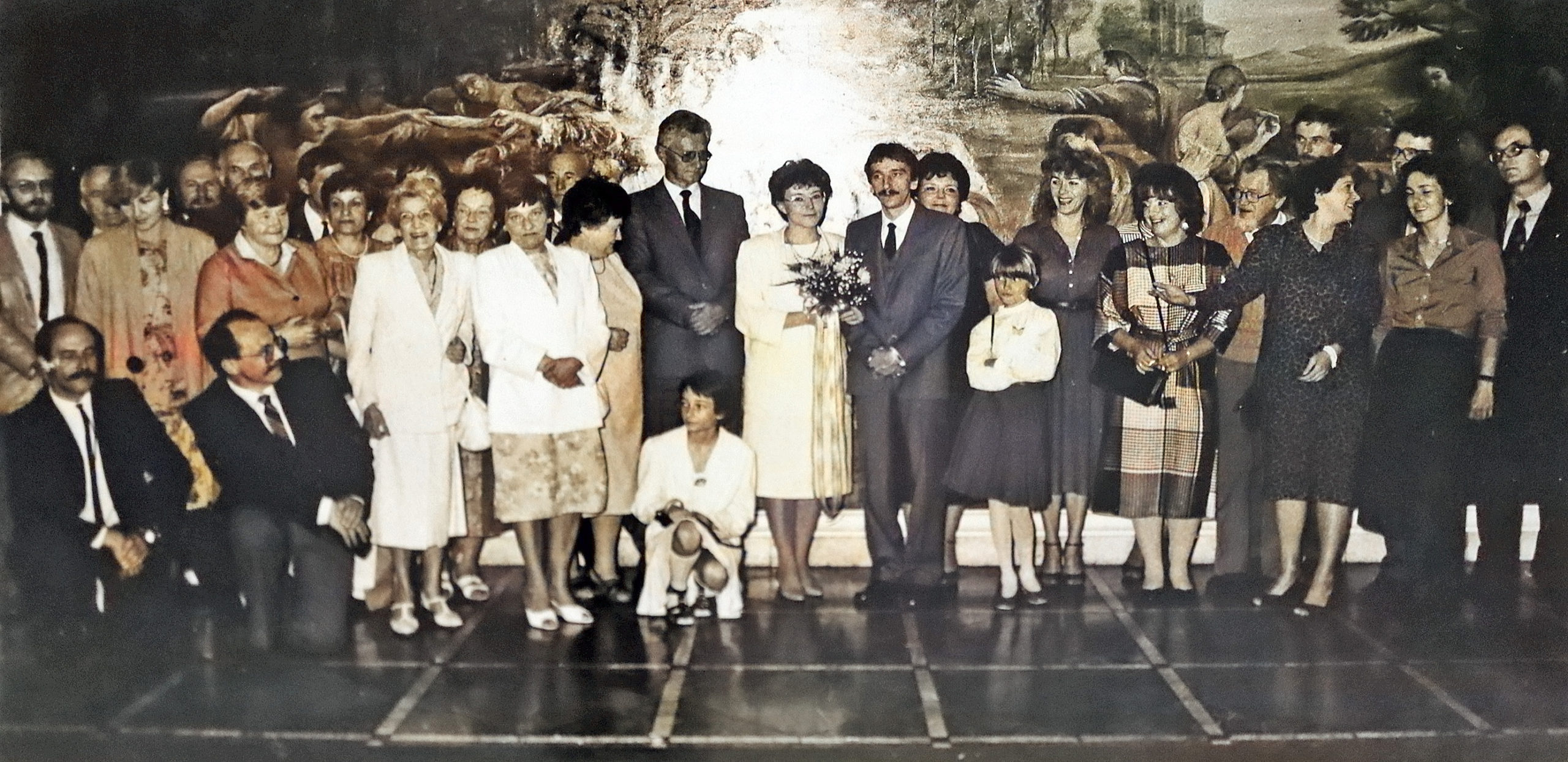 - 1984 nowożeńcy Joanna i Krzysztof Śmigielscy kucają, w tłumie m.in. p Niedźwieccy, Barbara Wądolny, Wendelin Kowarzyk z żoną, Zofia Skarbińska, Asia i Jacek Tomasiowie, Małgorzata i Jacek Drużyńscy, p Śmigielscy i brat, brat Doroty Luchter z rodziną
